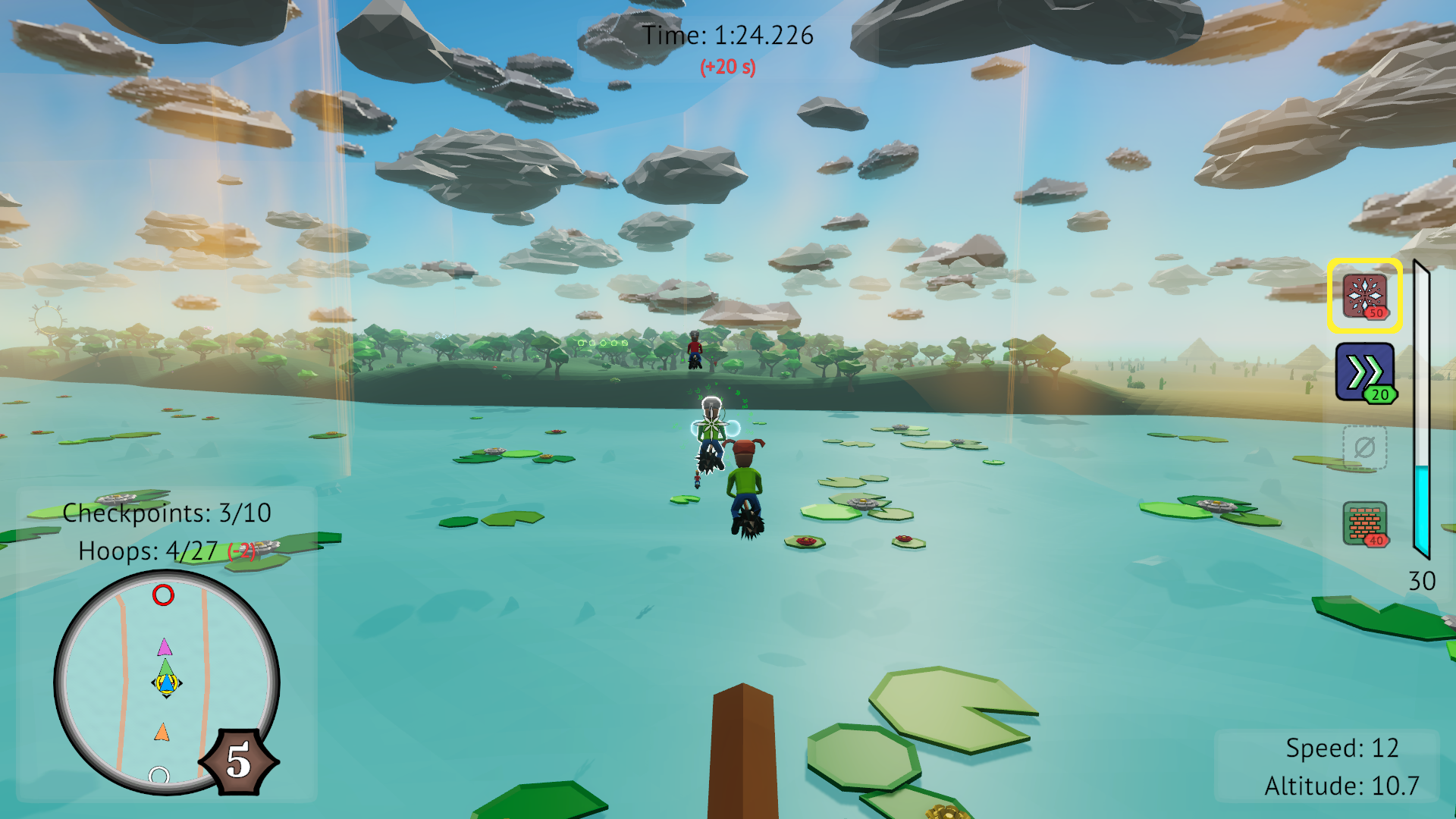 Brooom is a 3D broom racing game in which you fly through hoops, collect power-ups, use magic to your advantage in race and compete with opponents to become the number one. Tracks are procedurally generated and difficulty adapts to player's abilities.